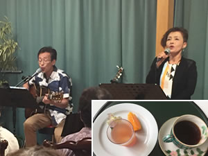 青春よ再びコンサート(2016/6/7) 夫婦デュオ「ちゃ茶」の和輝のぼるさん、まなさんに、青春時代のメロディーを歌っていただきました。 川の流れのように、夢で逢えたら、恋の歌など9曲を楽しみました。思い出深い曲に、当時の思い出も甦り目頭が熱くなる場面もありました。 デザートも口当たりが柔らかく、すっきりした甘みで大満足でした。 |